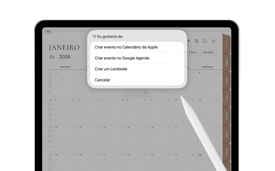 Com apenas um toque, você cria eventos, adiciona tarefas e mantém tudo sincronizado entre seus dispositivos — de forma prática, simples e diretamente do seu planner por meio de um pop-up.